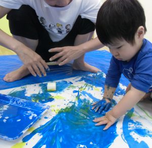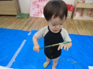 顔に絵の具がついても夢中になって筆を走らせ、大喜びの子どもたち。