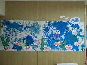 筆やお星さまのスタンプ、手の平を使って大きな模造紙に自由にぬりぬり!