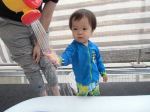 ”水あそび”の歌に合わせながら、シュシュシュシュ~!と水鉄砲発射!