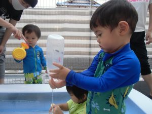 今日は子どもたちが楽しみにしていたプールで水遊びをしました。